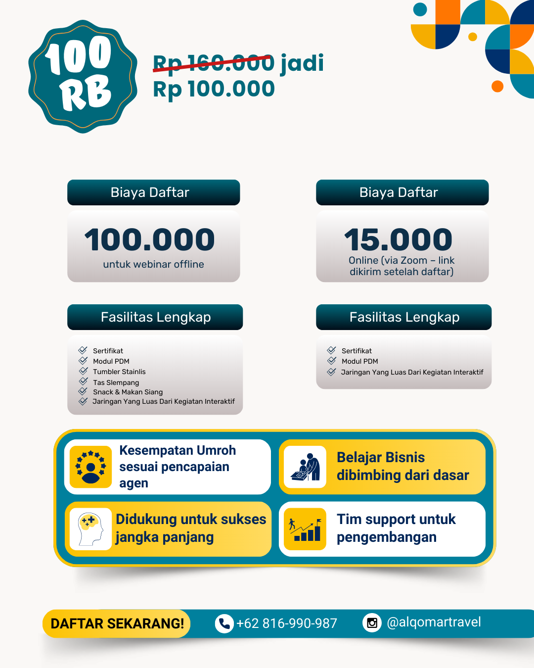 Dan yang bikin makin seru, cukup bayar Free khusus kamu (harga spesial dari Rp160.000), kamu udah dapet banyak benefit, mulai dari modul PDM, sertifikat, tumbler stainless kece, tas slempang, snack, makan siang, sampai relasi baru sesama calon agen. 🎁